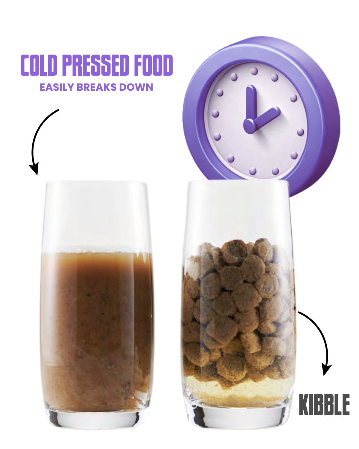 A: Cold-pressed, breaks down from the outside in, gently and without expanding. This is quite similar to how dogs process raw foods, so it's natural and a lot gentler on their digestion.